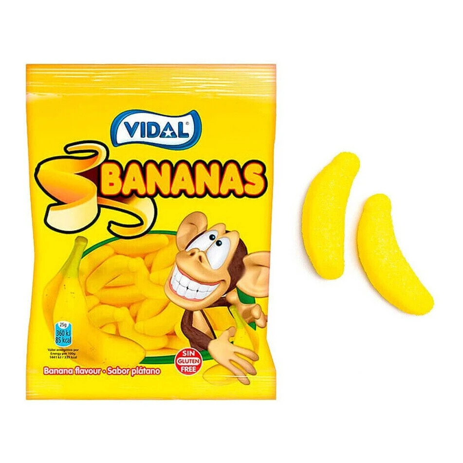 Ce paquet est composé de bonbons enrobés de sucre en forme de banane jaune.