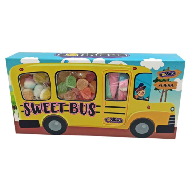 Fantastique boîte en forme de bus remplie de bonbons assortis, parfaite pour offrir à vos invités ou pour offrir en cadeau et profiter de leur saveur authentique.