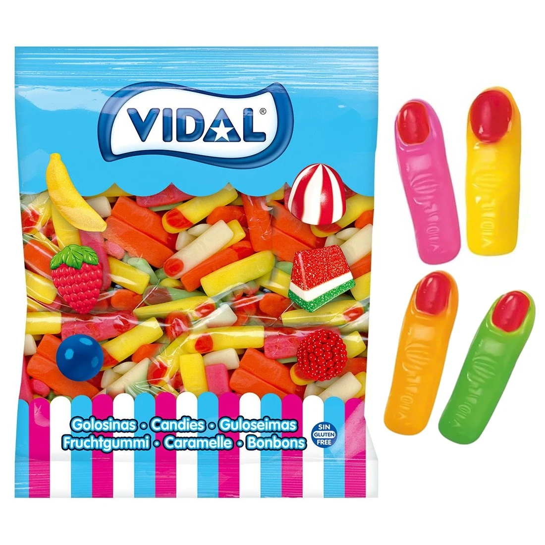 Amusants bonbons en gélatine en forme de doigt coupé, chacun de couleur différente. Livrés dans un sac d’un kilo.