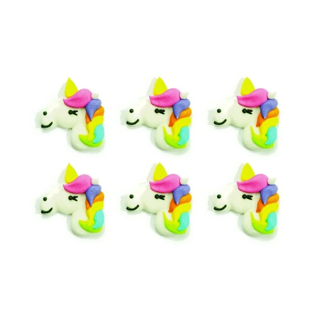 Des têtes de licornes aux cheveux de couleurs vives en sucre pour décorer n’importe quel bonbon.