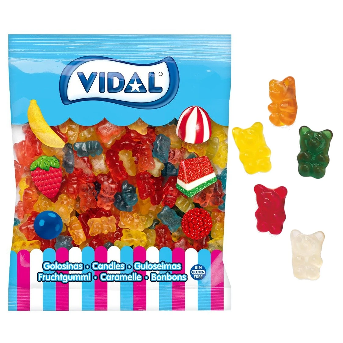 Sac contenant des ours en peluche sans gluten aux couleurs vives et au goût délicieux. Ils ont un aspect brillant et semi-transparent.