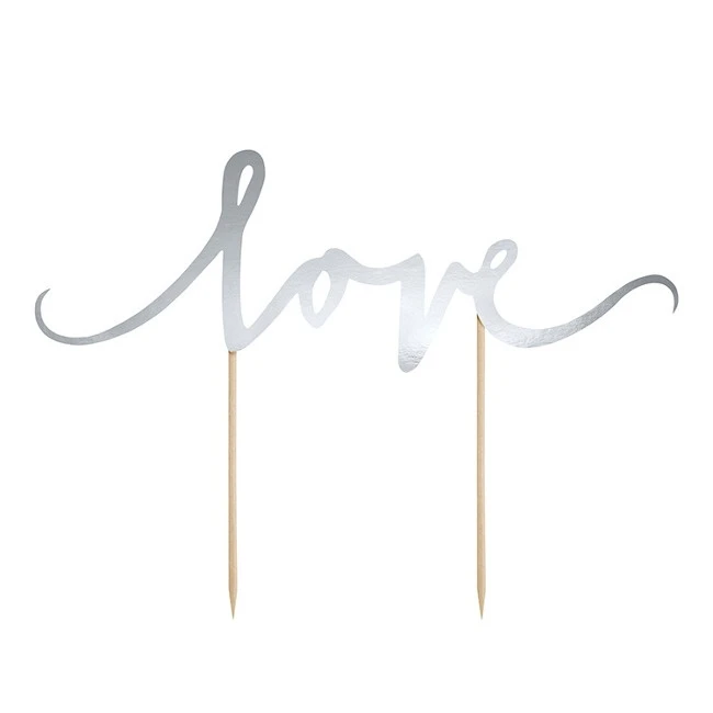 Pièce décorative formée par le mot amour de couleur argentée et deux brochettes qui permettront d’incorporer le produit au gâteau ou à une autre base.