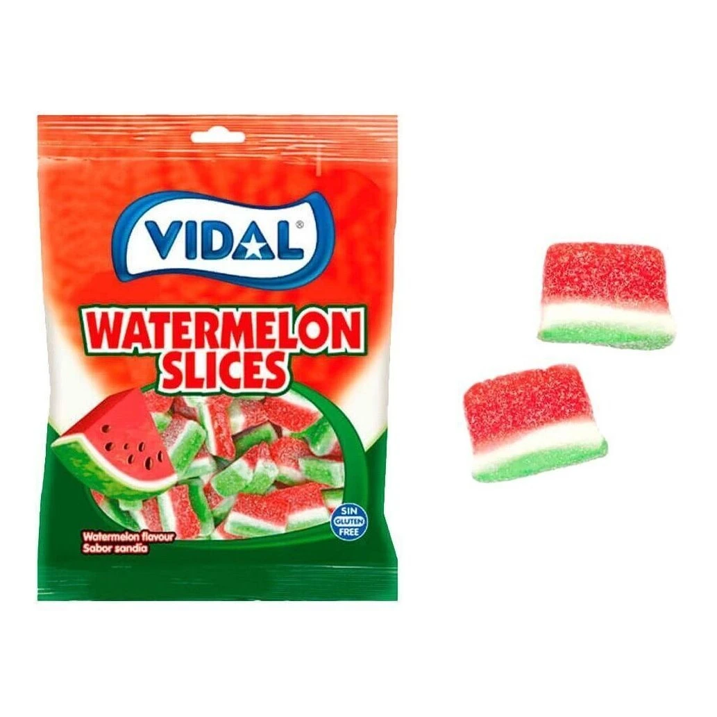 De délicieux bonbons de forme triangulaire qui ressemblent à des tranches de pastèque de couleur verte, blanche et rouge. Ils sont recouverts de sucre.